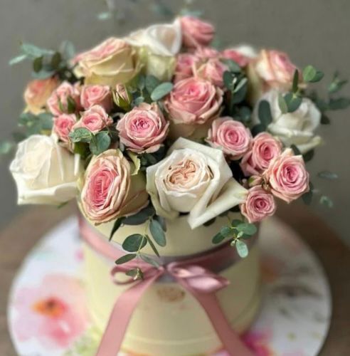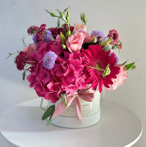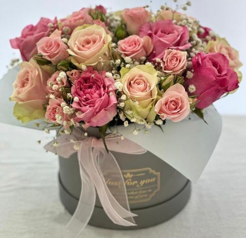 Composición de flores frescas cuidadosamente seleccionadas y presentadas en una caja decorativa,